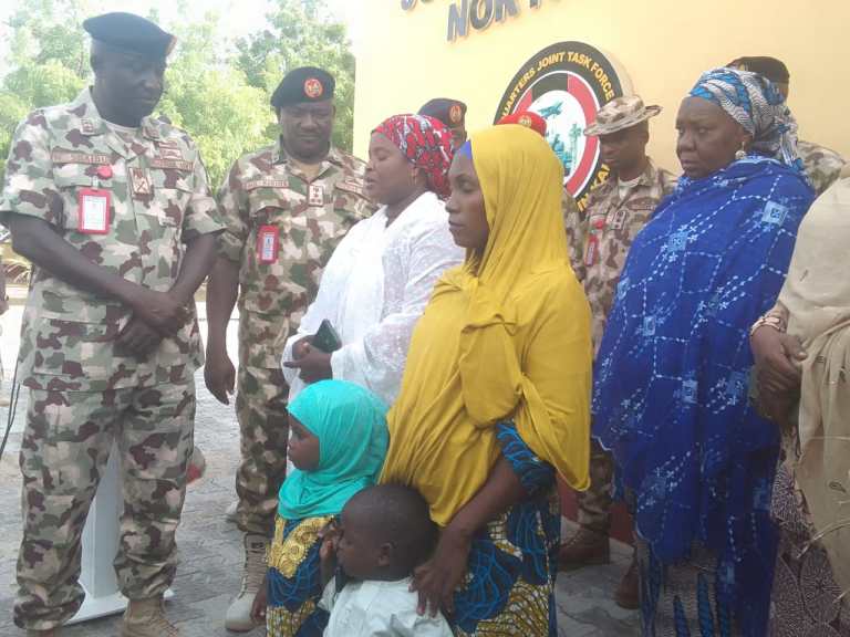 The Operation” Hadin Kai” theatre command in the North East, Major General Shuaibu Waidi has handed over another Chibok school girl, Ihi Abdul with her two children and 330 women and children who were rescued from the dens of Boko Haram Terrorists during various operation in the Sambisa forests to Borno government.
